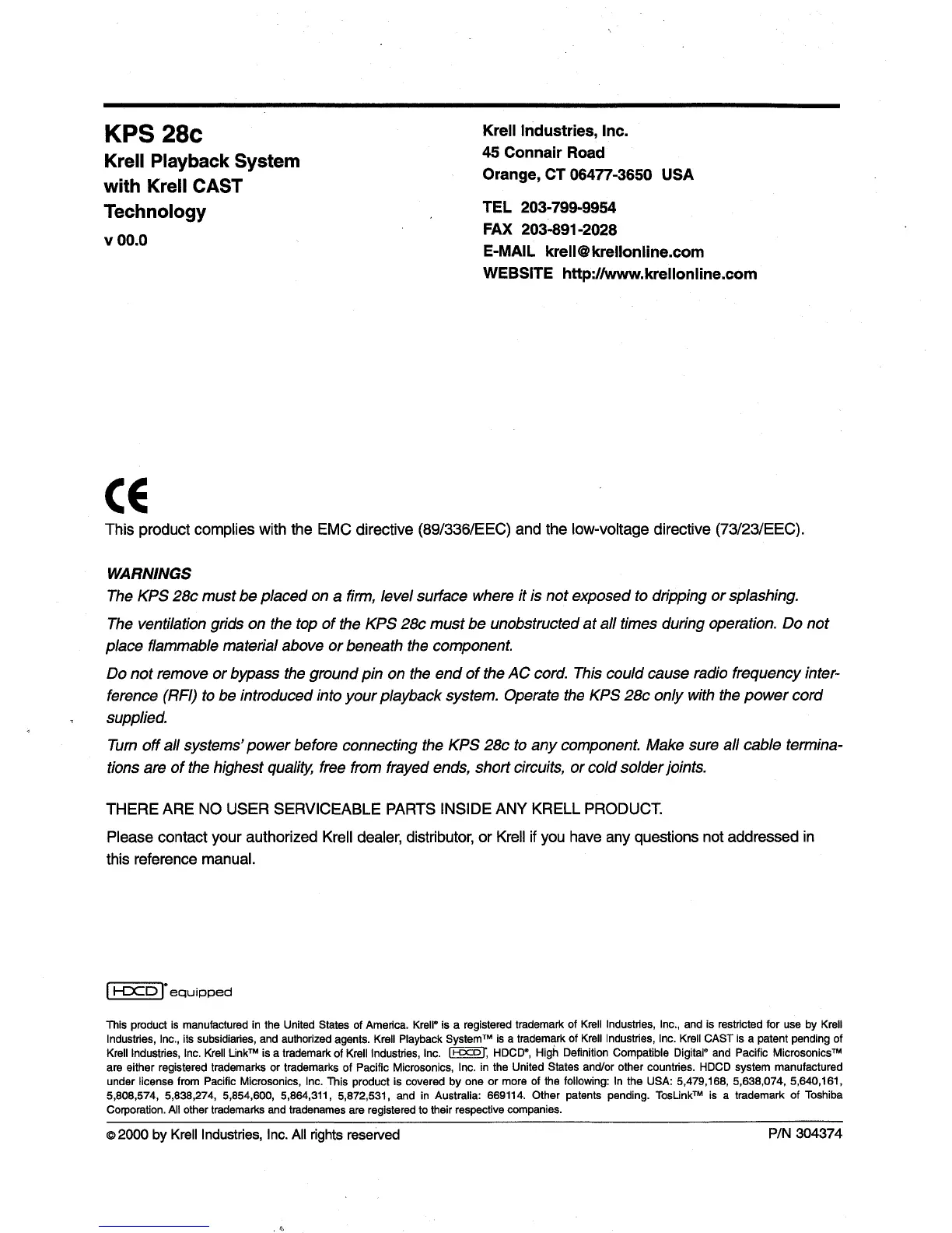 © 2000 by Krell Industries, Inc. All rights reserved P/N 304374
