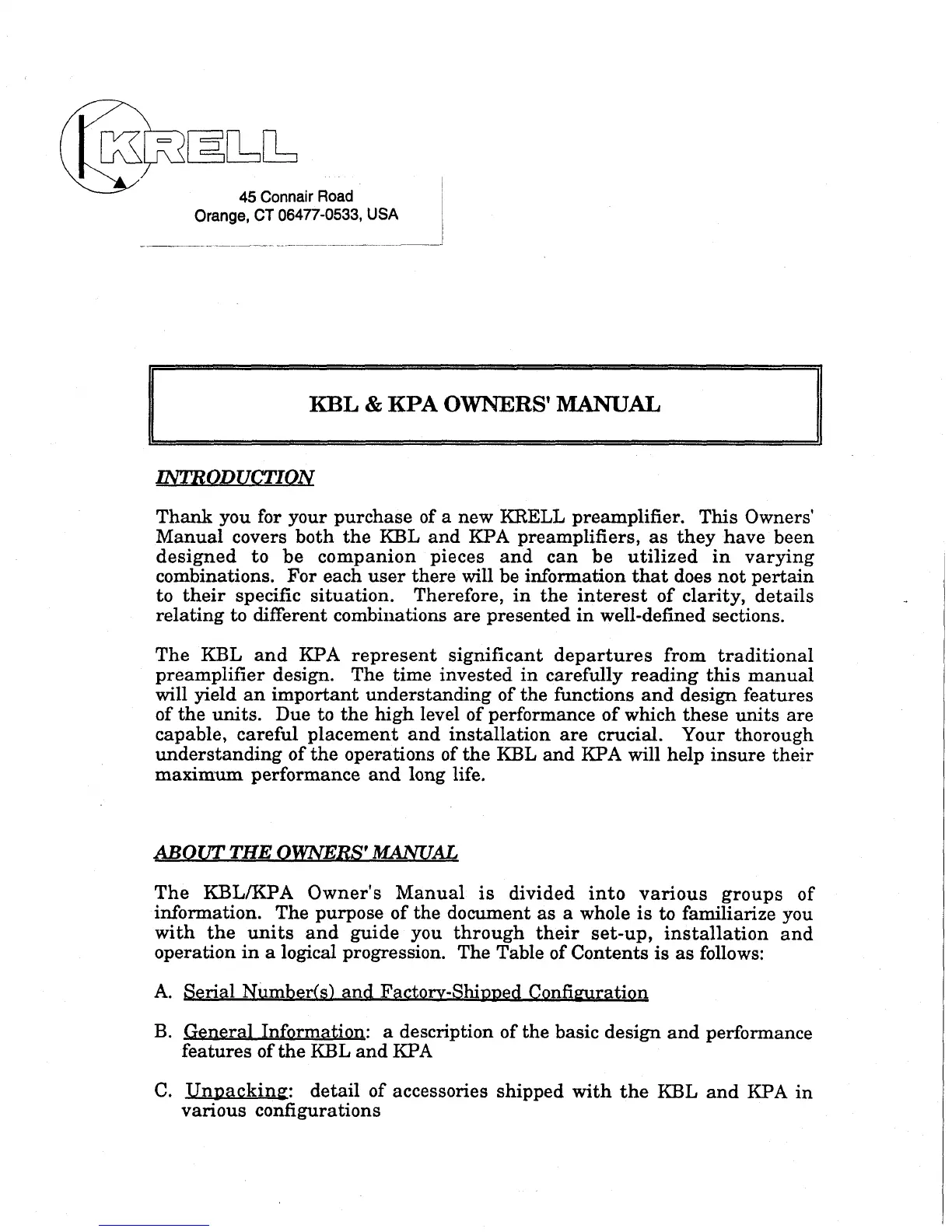 Manual covers both the KBL and KPA preamplifiers, as they have been