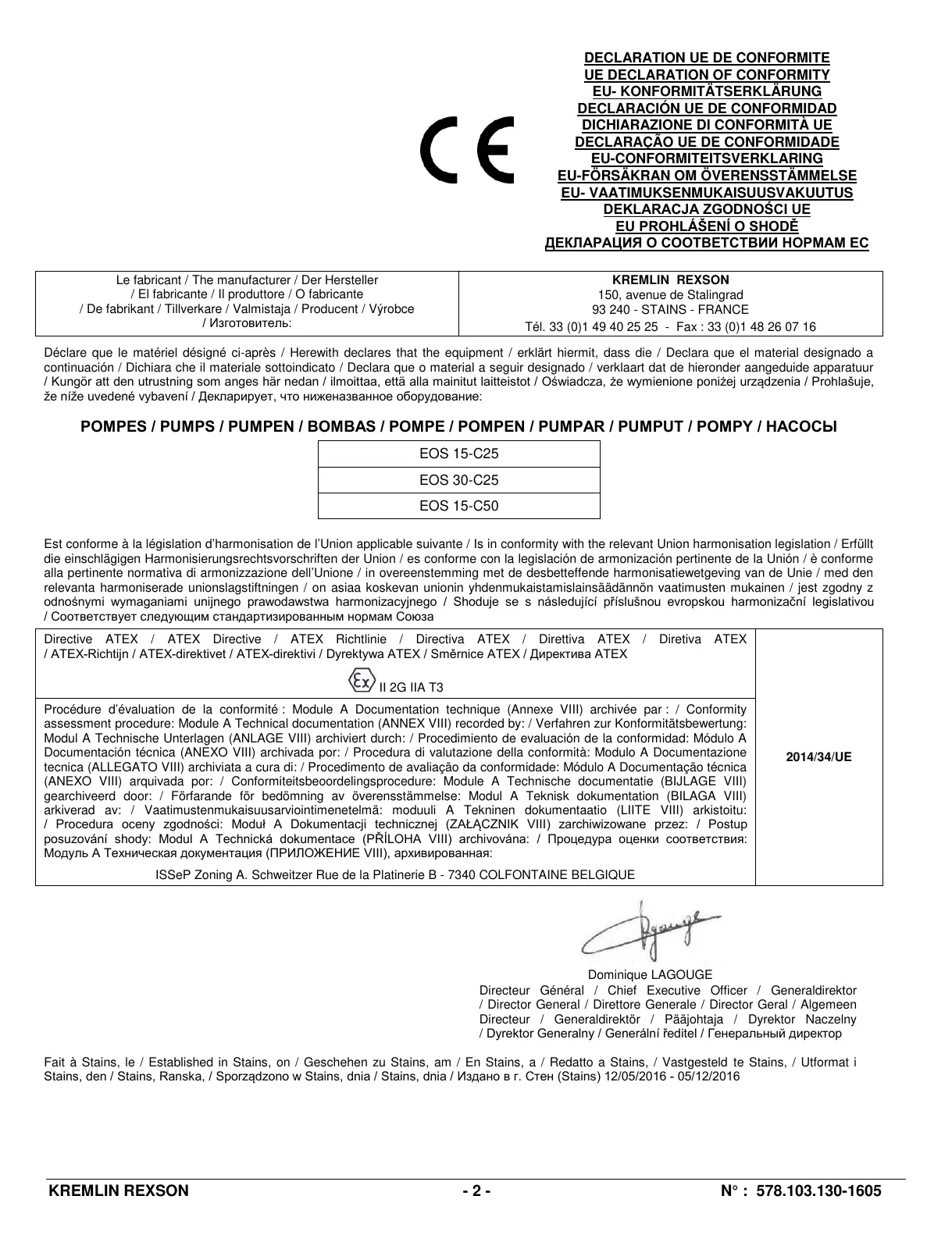 Stains, den / Stains, Ranska, / Sporządzono w Stains, dnia / Stains, dnia / Издано в г. Стен (Stains) 12/05/2016 - 05/12/2016