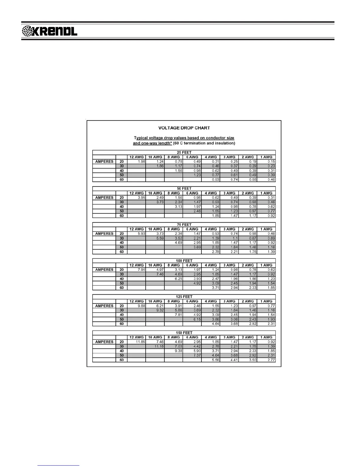 Ex:A two-wire 20-ampere circuit using 12 AWG with a one-way distance of 25 feet will drop 1.98 volts;
