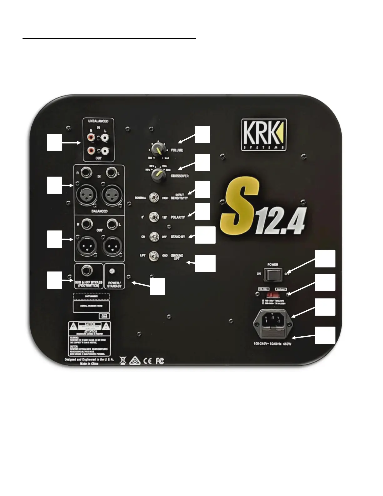在安装和连接 KRK 录音室低音炮之前,请阅读各系统控件的说明,以便熟悉各种功能。