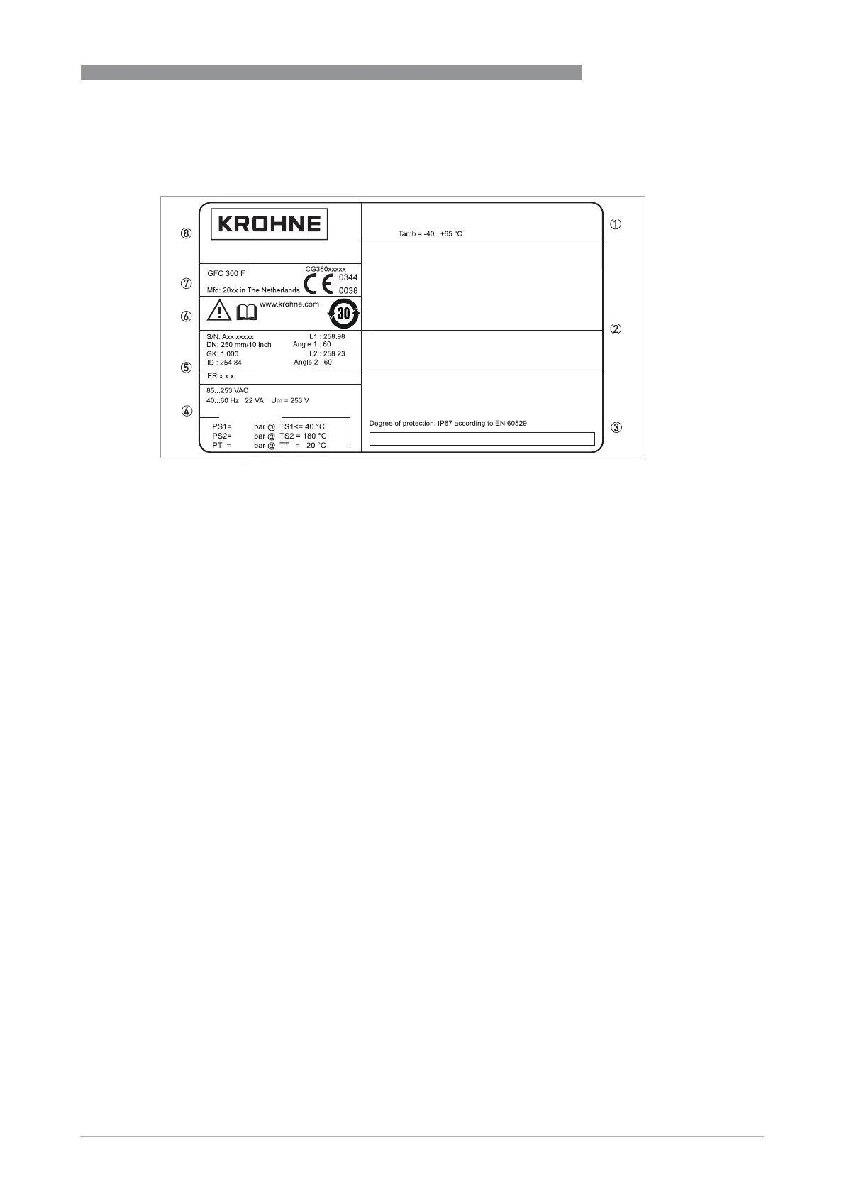 7 Type designation and manufacturer date of the flowmeter / CE sign with number(s) of notified body / bodies
