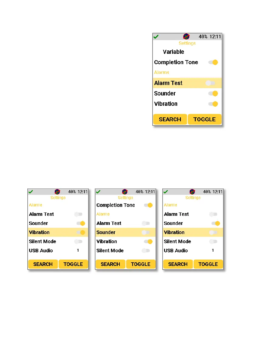 Navigating to the alarm test setting allows for
