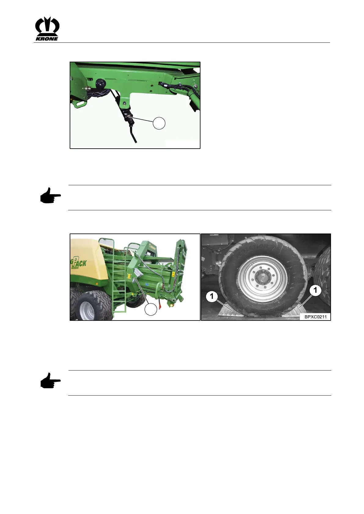 The wheel chocks (1) are located at the rear on the right and left next to the bale channel