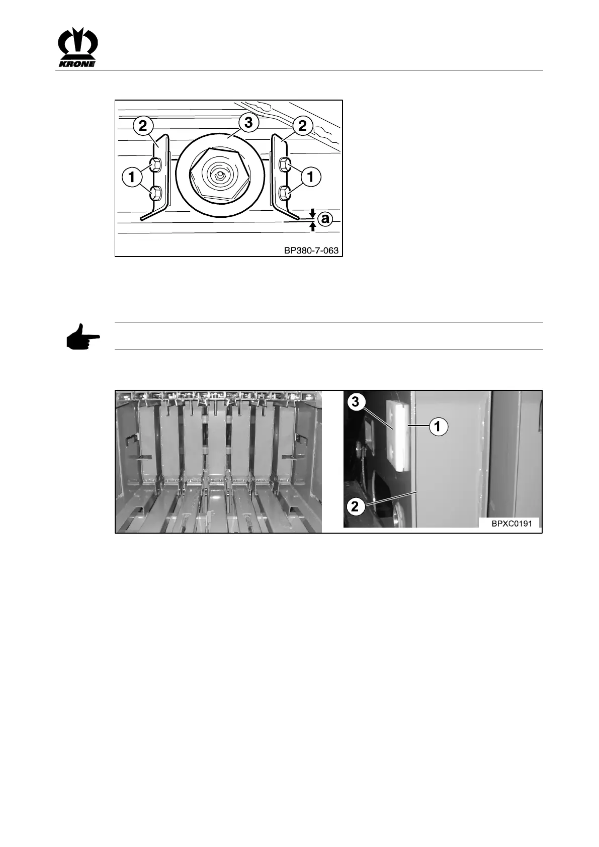 running rails of the baling ram. To adjust, loosen the screws (1) and adjust the cleaning rails to