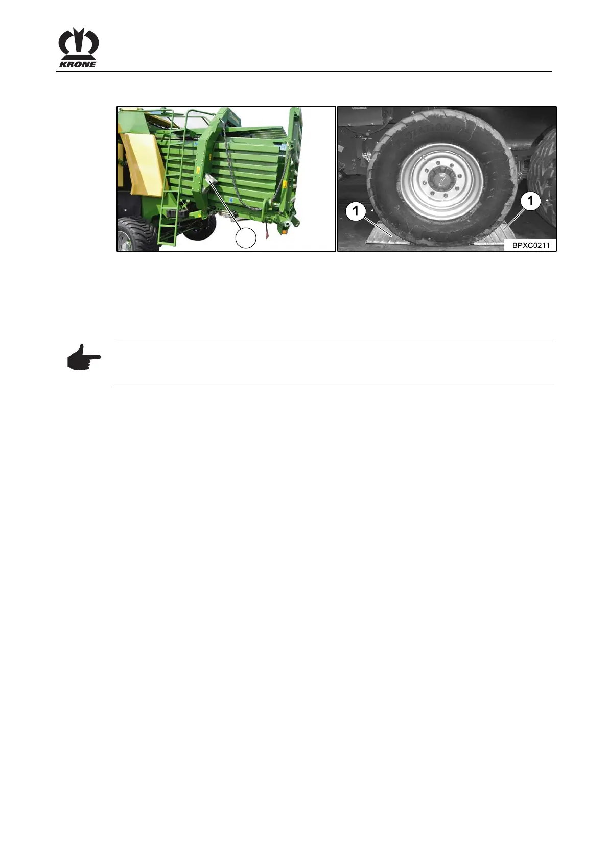 The wheel chocks (1) are located at the rear on the right and left next to the bale channel