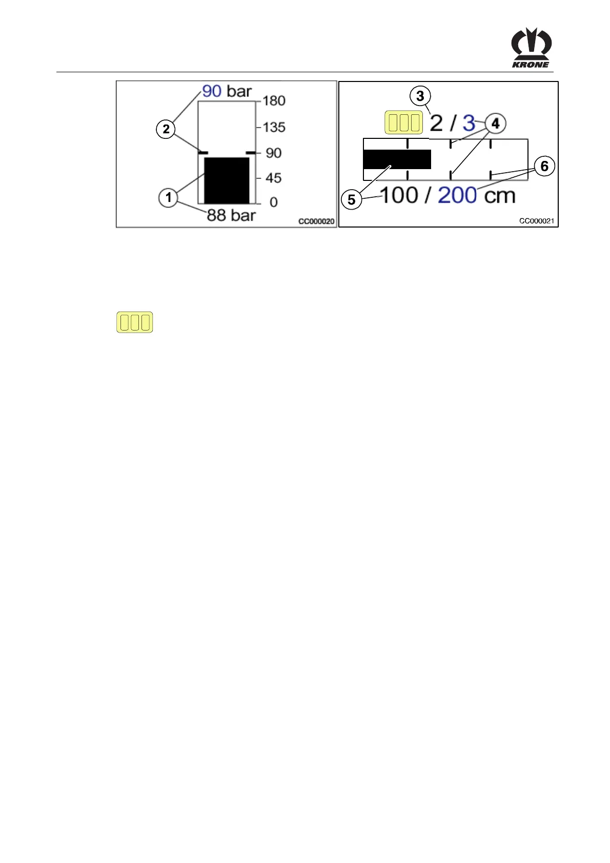 as the length of the bar (5). The second value and the marking (6) shows the set bale length.