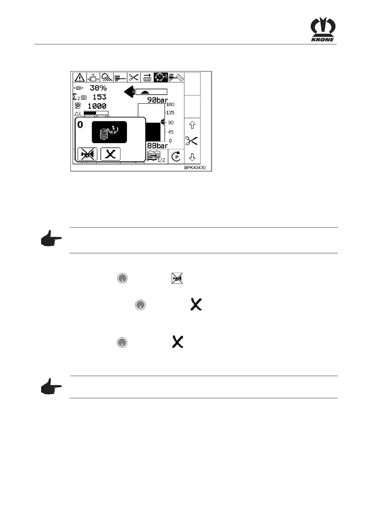 Pos: 26.40 /BA/Inf o-Center/Großpacken presse/Hauptmenüs/ Alarmmeldungen/ Hinweis Das Löschen des Alar ms sollte nur im Notfall verwendet werden. @ 19\mod_1238 493729009_78.doc @ 219844