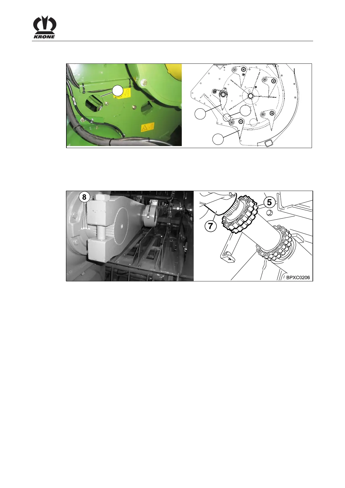 • Remove the roller chain (5) from the packer gearbox drive shaft (7)