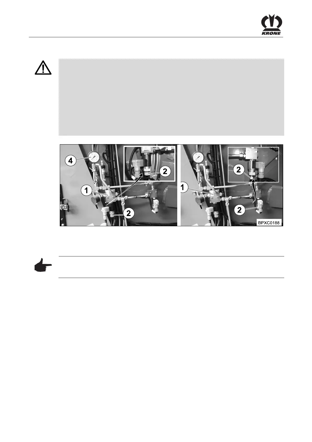Pos: 42.39.2 /BA/W artung/Großpackenpres sen/Hydraulikan lage / Bordhydraulik/ Gefahr - Presskraftregel ung im Notbetrieb @ 24\mod_1 241608452018_78.d oc @ 246649