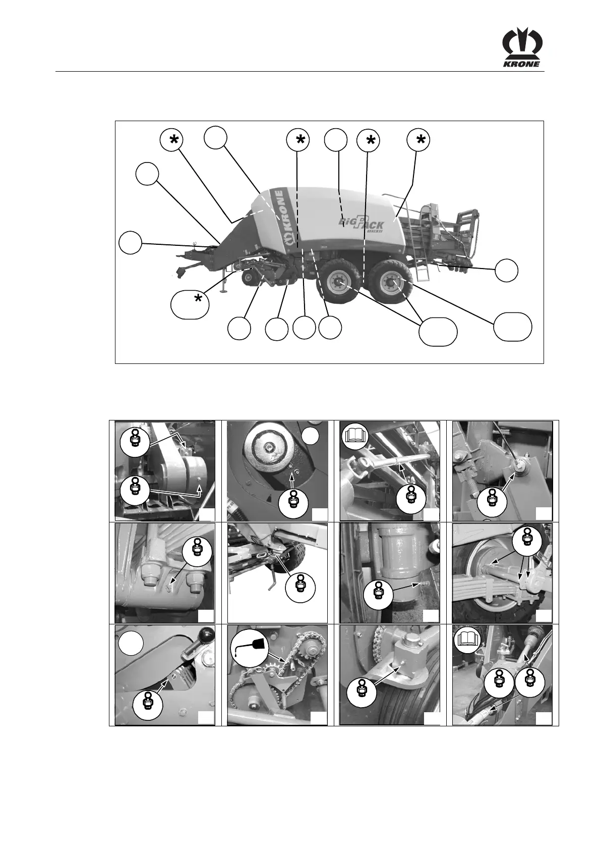 Lubrication points on the baler (left side of the machine)