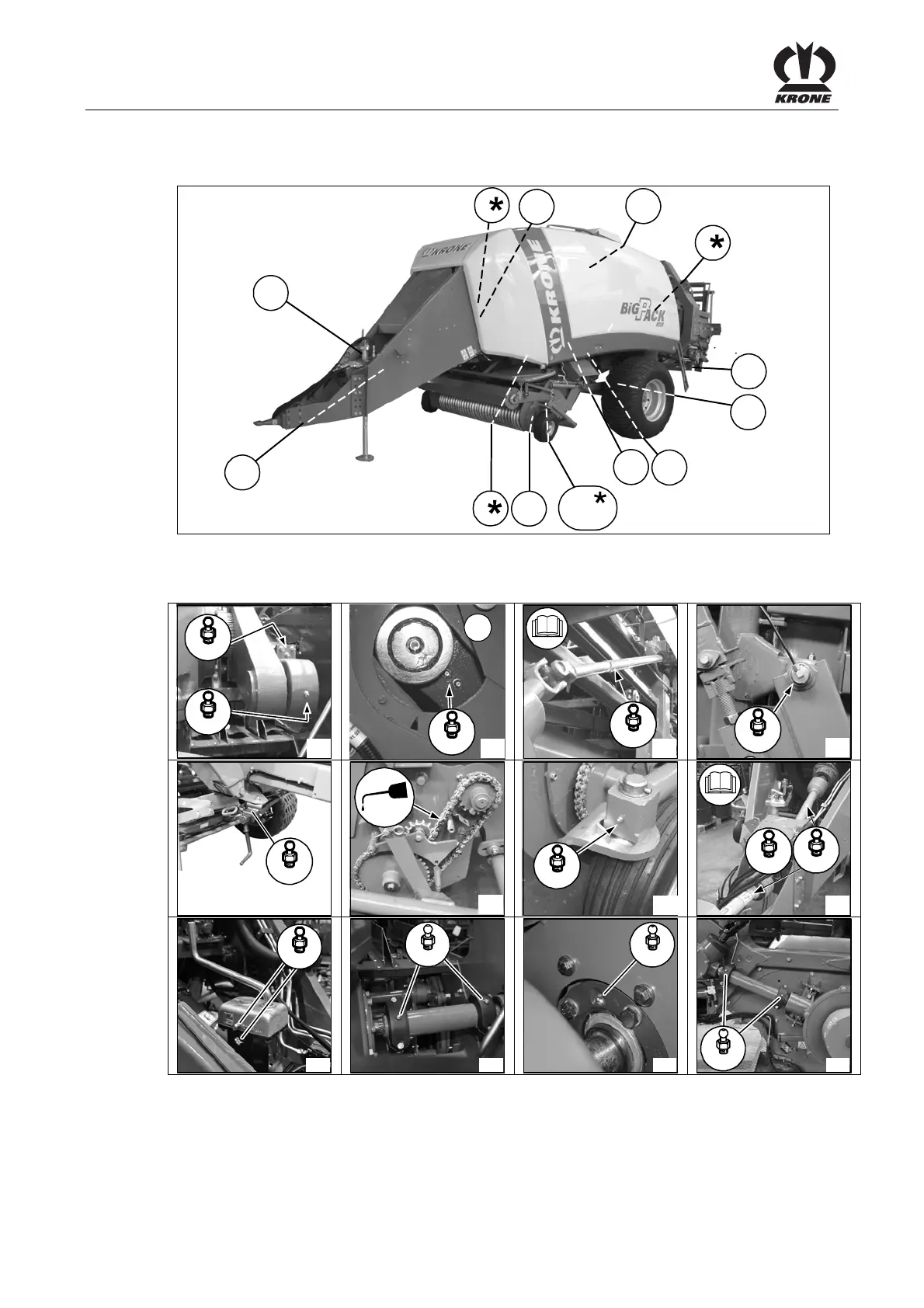 Lubrication points on the baler (left side of the machine)