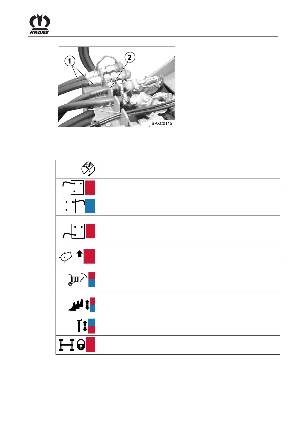 • Take the hydraulic hoses (1) out of their support (2) on the drawbar
