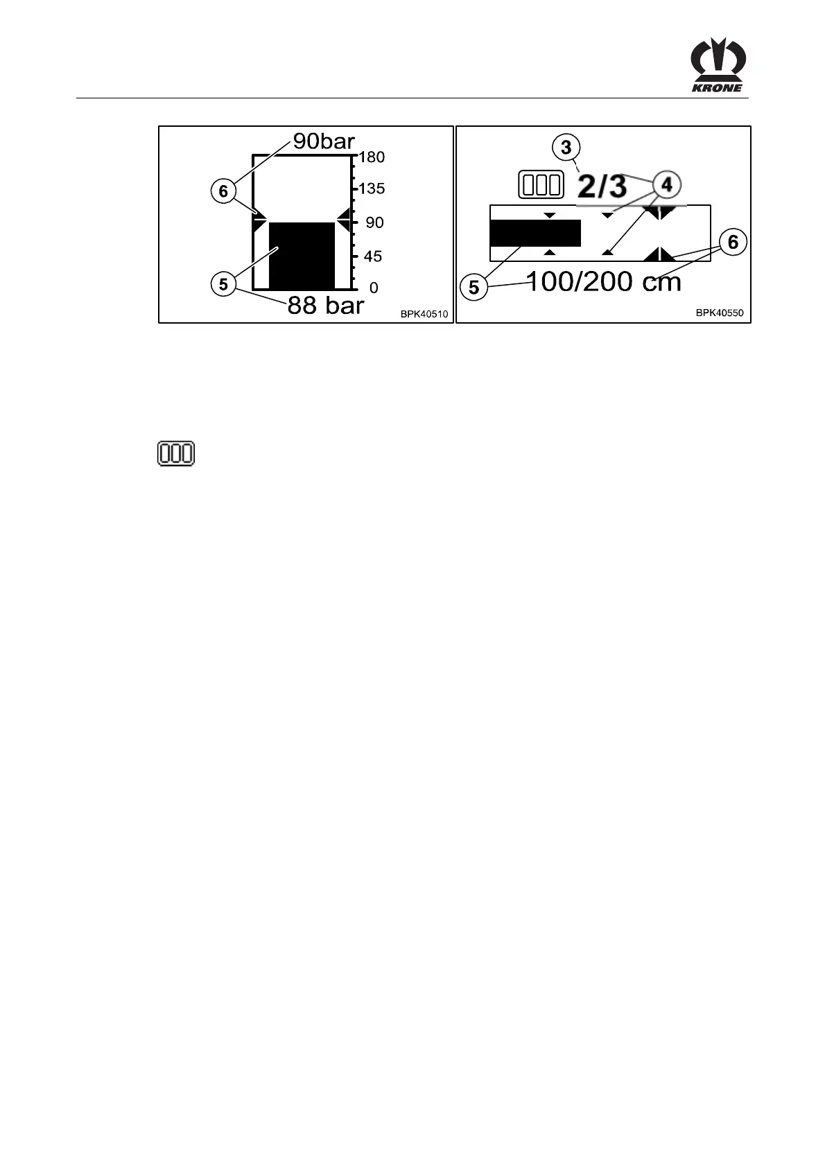 bale length. The second value and the big arrows (6) indicate the target bale length.