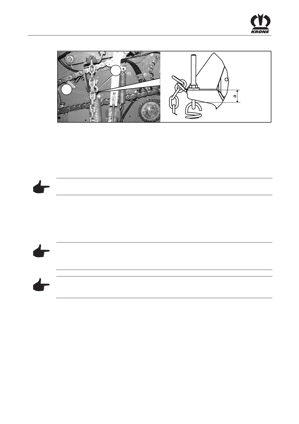 • Set the desired raking height of the pick-up by suspending the chain (2)