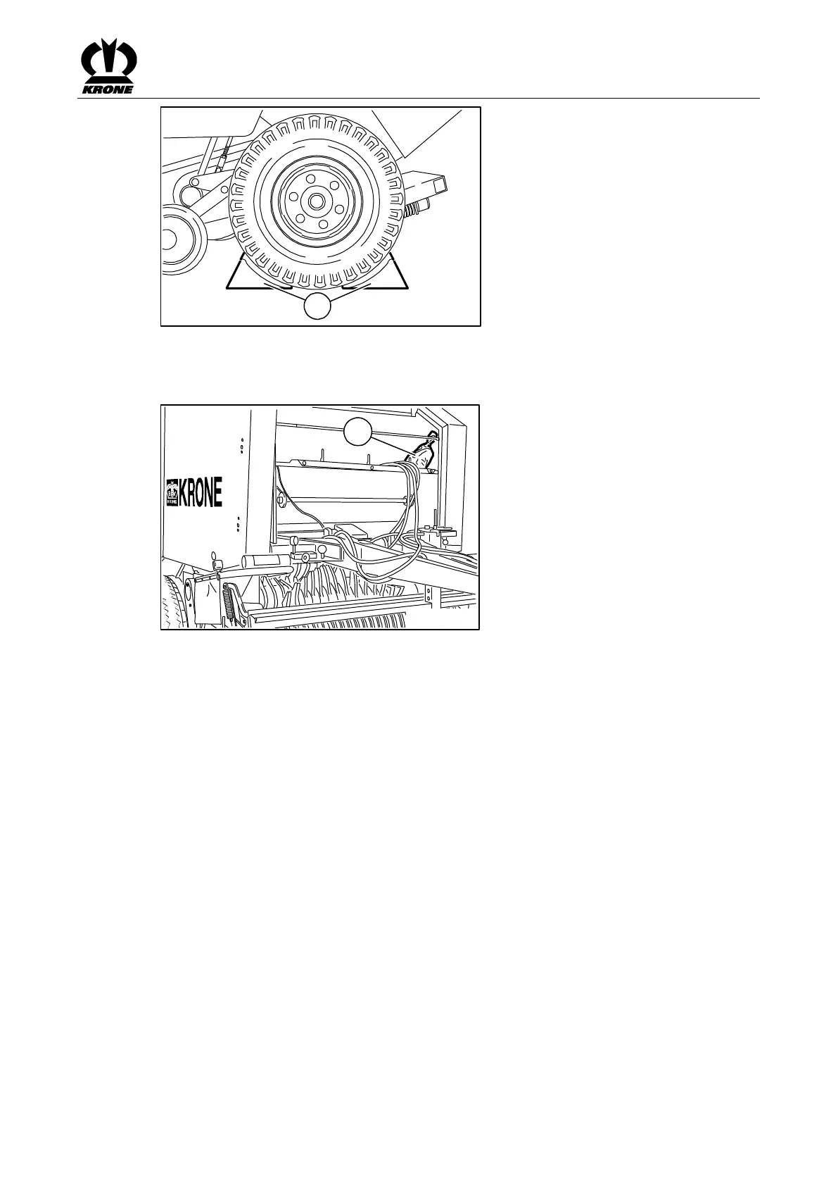 Place two wheel chocks (1) under the wheels to prevent the machine from rolling away.