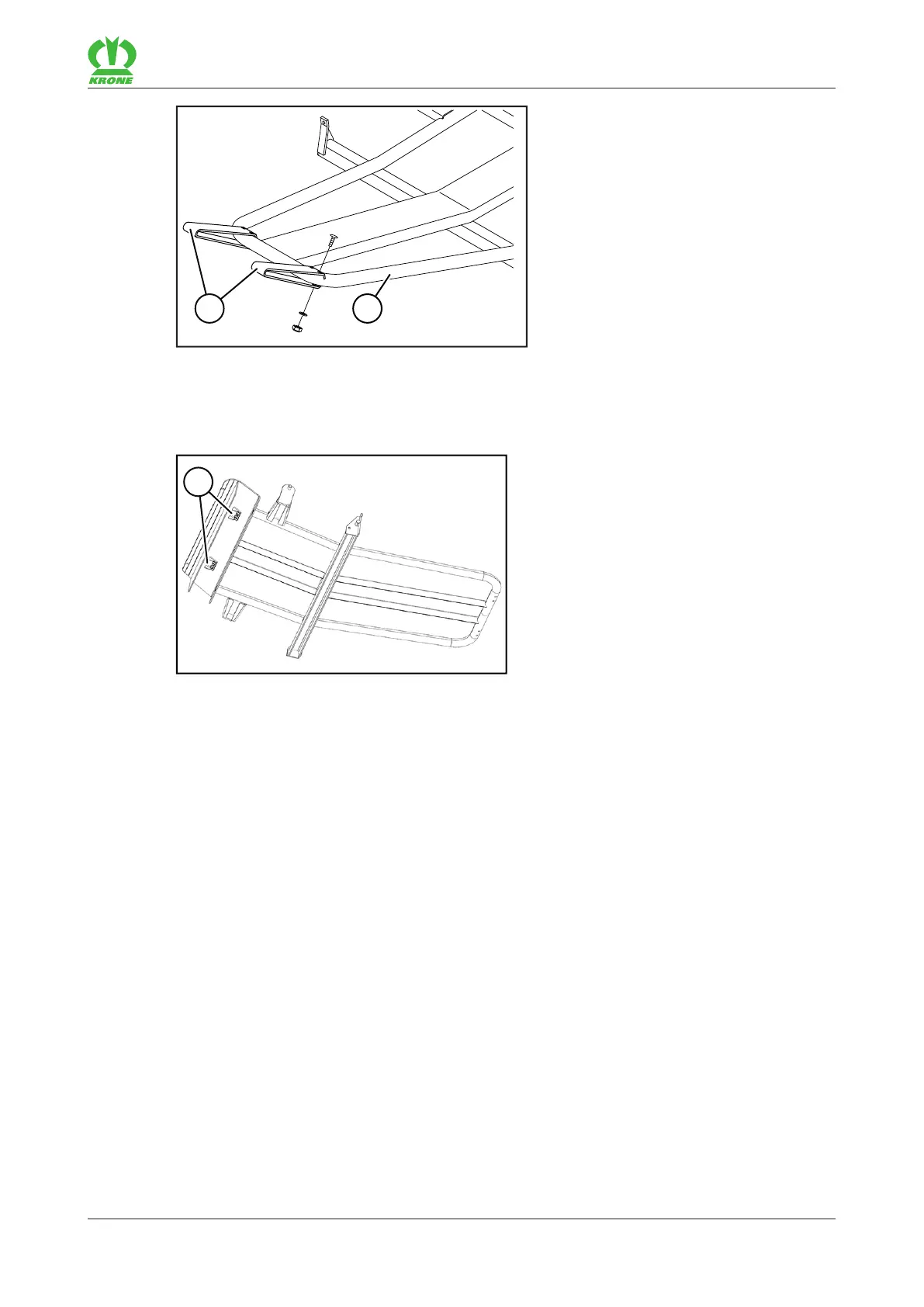 Mount the spacer (1) with the round-head screws, discs and nuts on the bale ejector (2).
