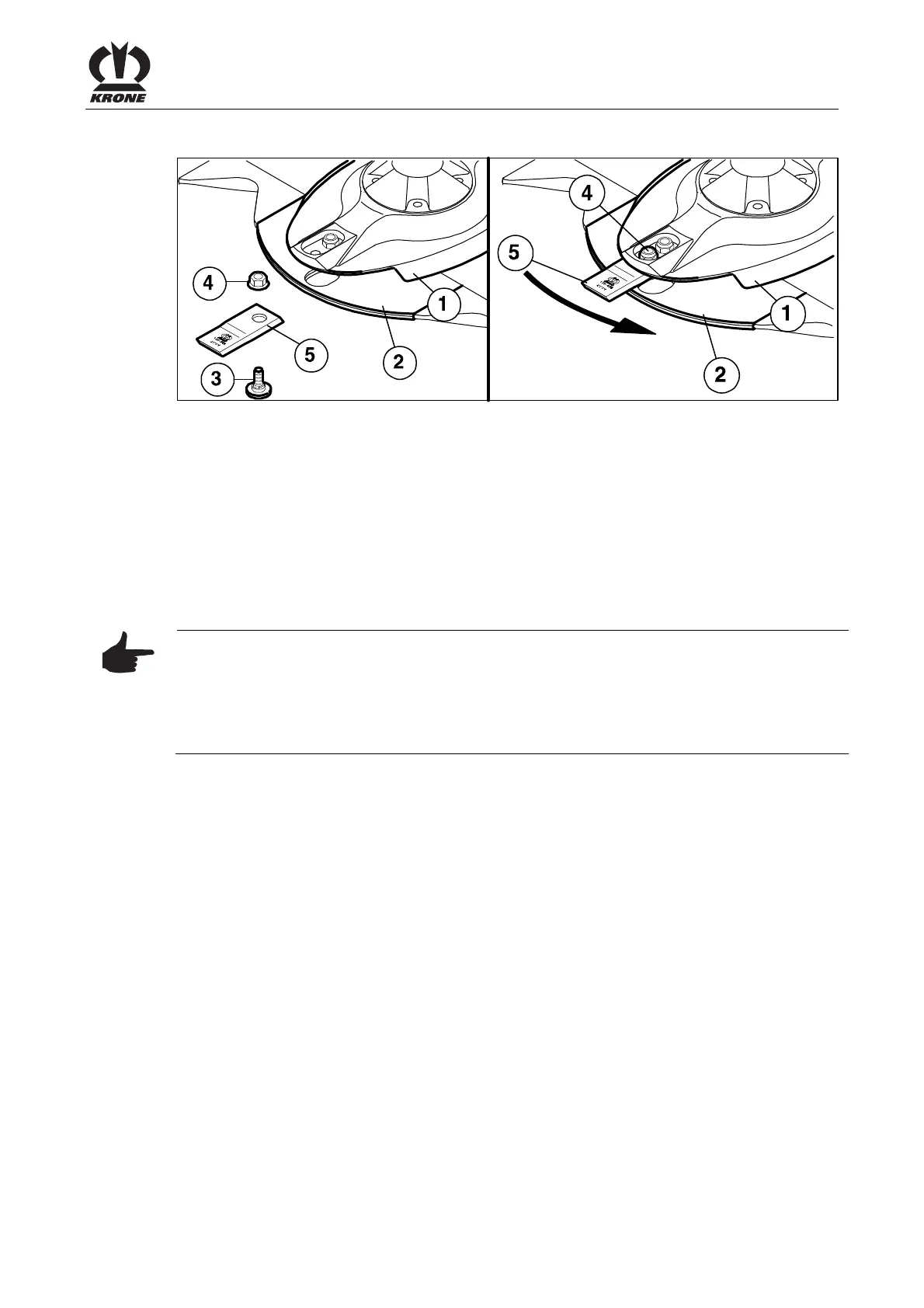 • To fit the blades, insert the blade (5) between the wear skid (2) and the cutting disc (1)