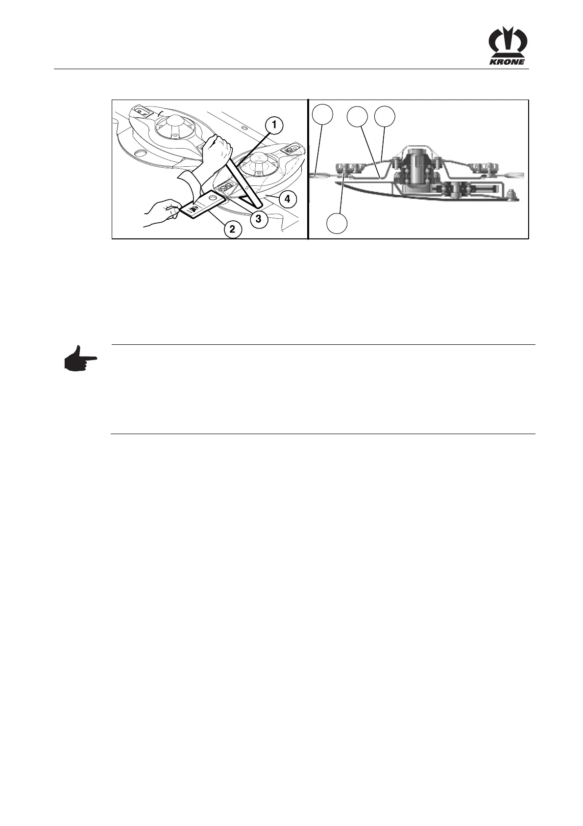 • Push the special tool (1) {blade key} between the cutter disc (4) and leaf spring (3) and
