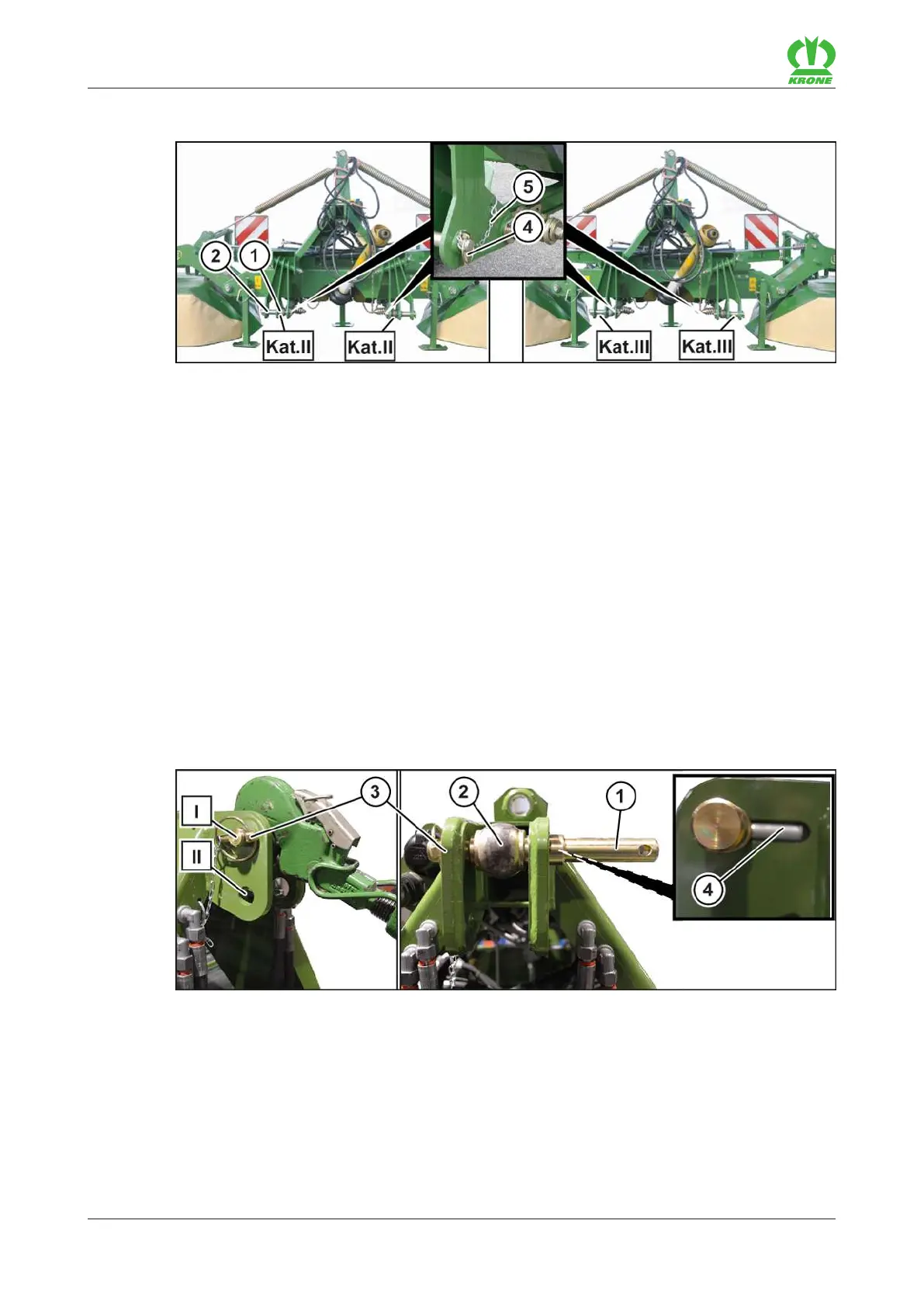 Secure the lower link pins (2) with the linch pin (4) and the safety chain (5).