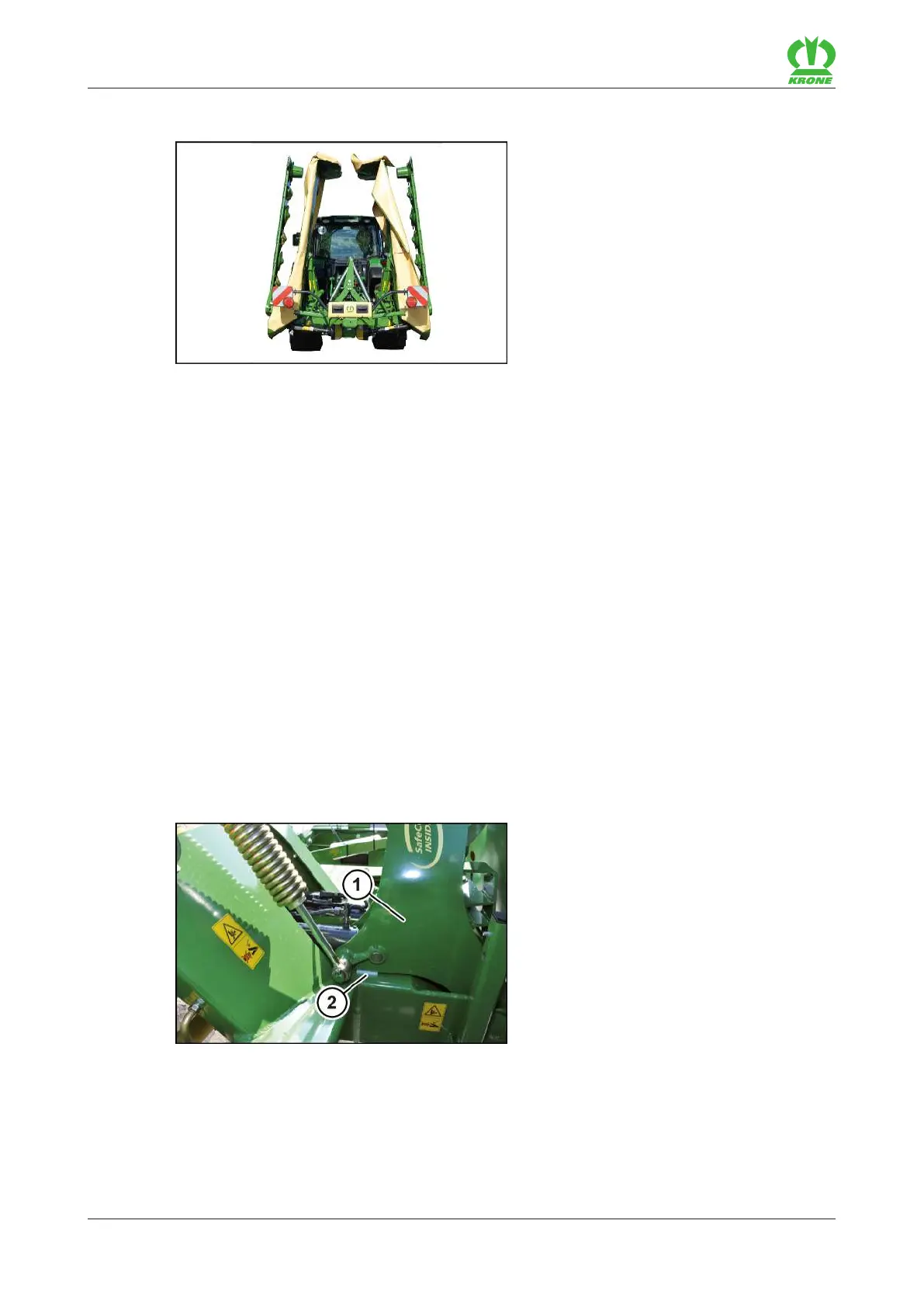 Make certain after swivelling the mowers up that the outrigger arms (1) right and left are fully
