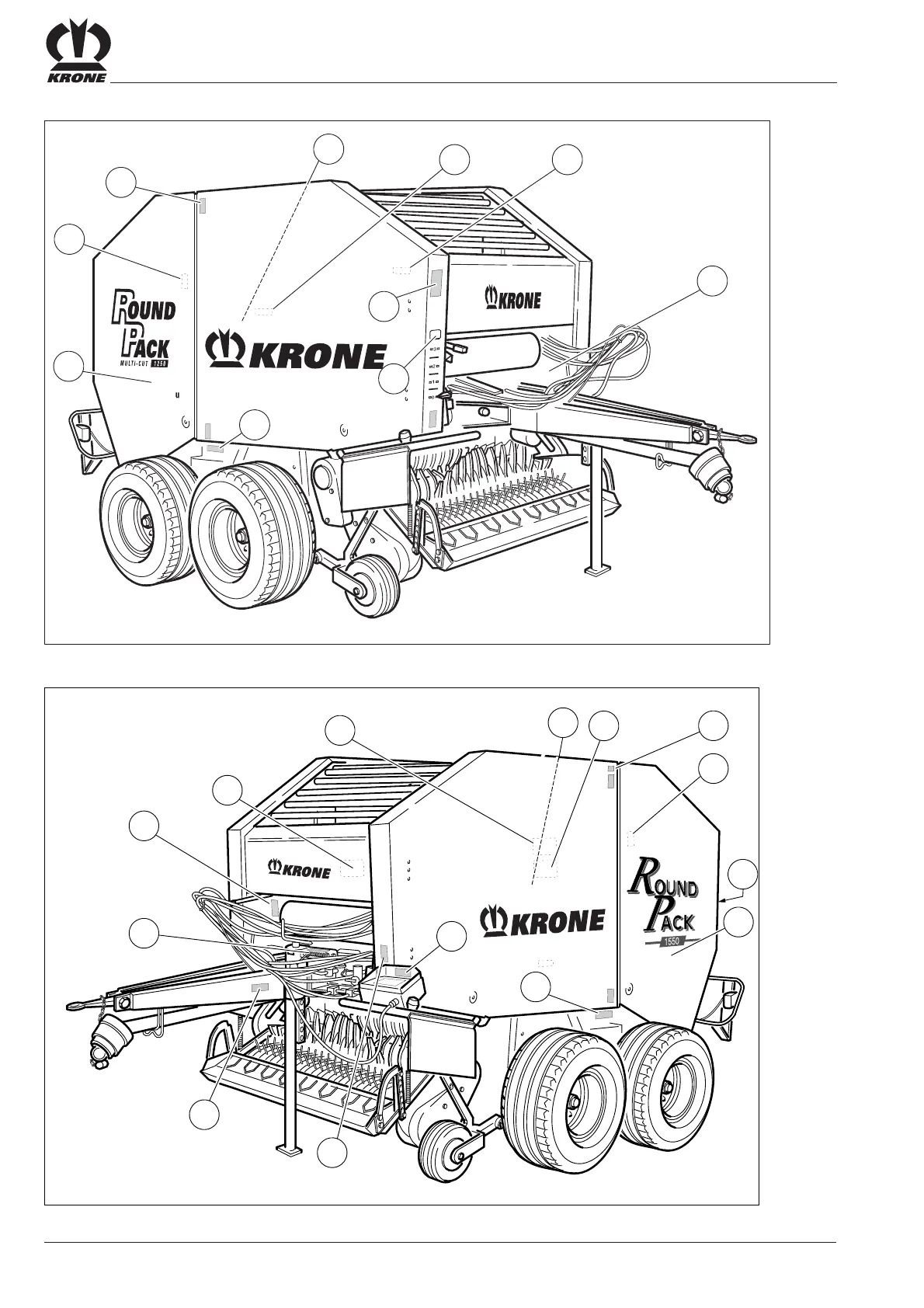 Krone Round Pack 1550 - Location of General Information Labels on the Machine