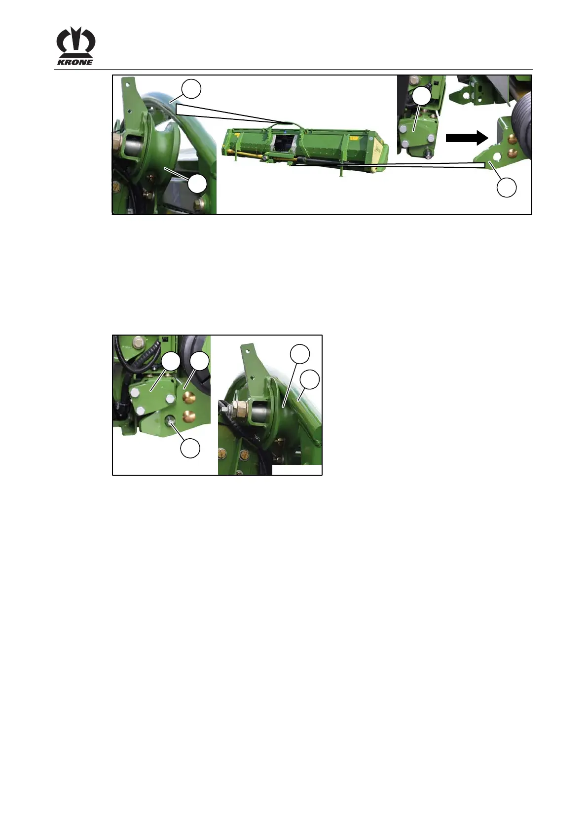 • Drive the forage harvester up to the machine until the roll guides (1) are under the support