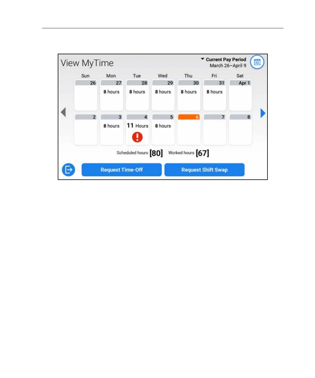 affected shift is denoted by an exclamation point; tapping it shows the exception