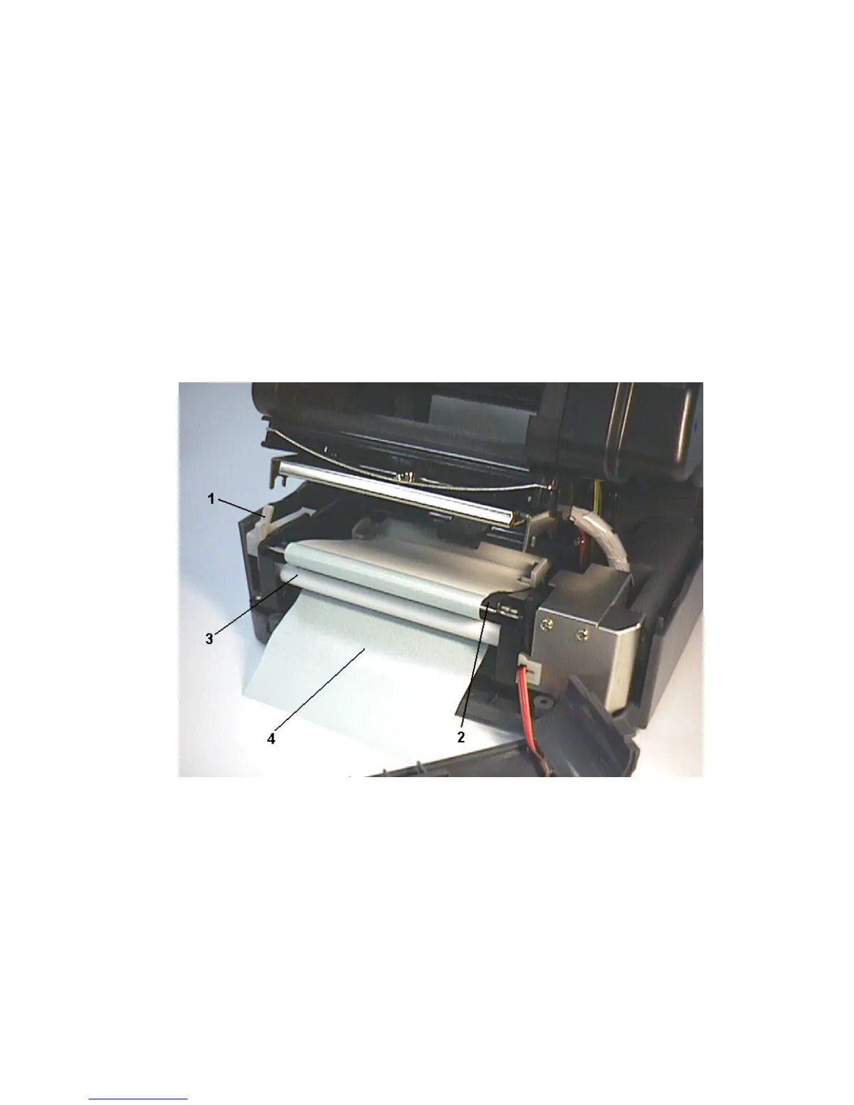 Feed the backing paper between the platen and the white “self-peeling” roller,