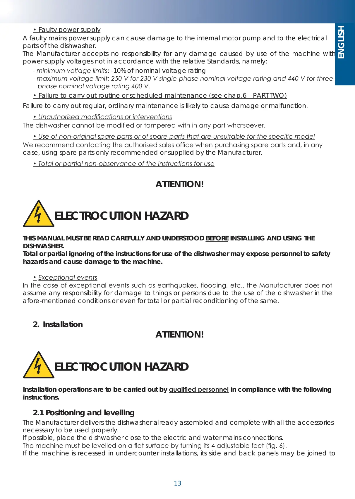 In the case of exceptional events such as earthquakes, ooding, etc., the Manufacturer does not