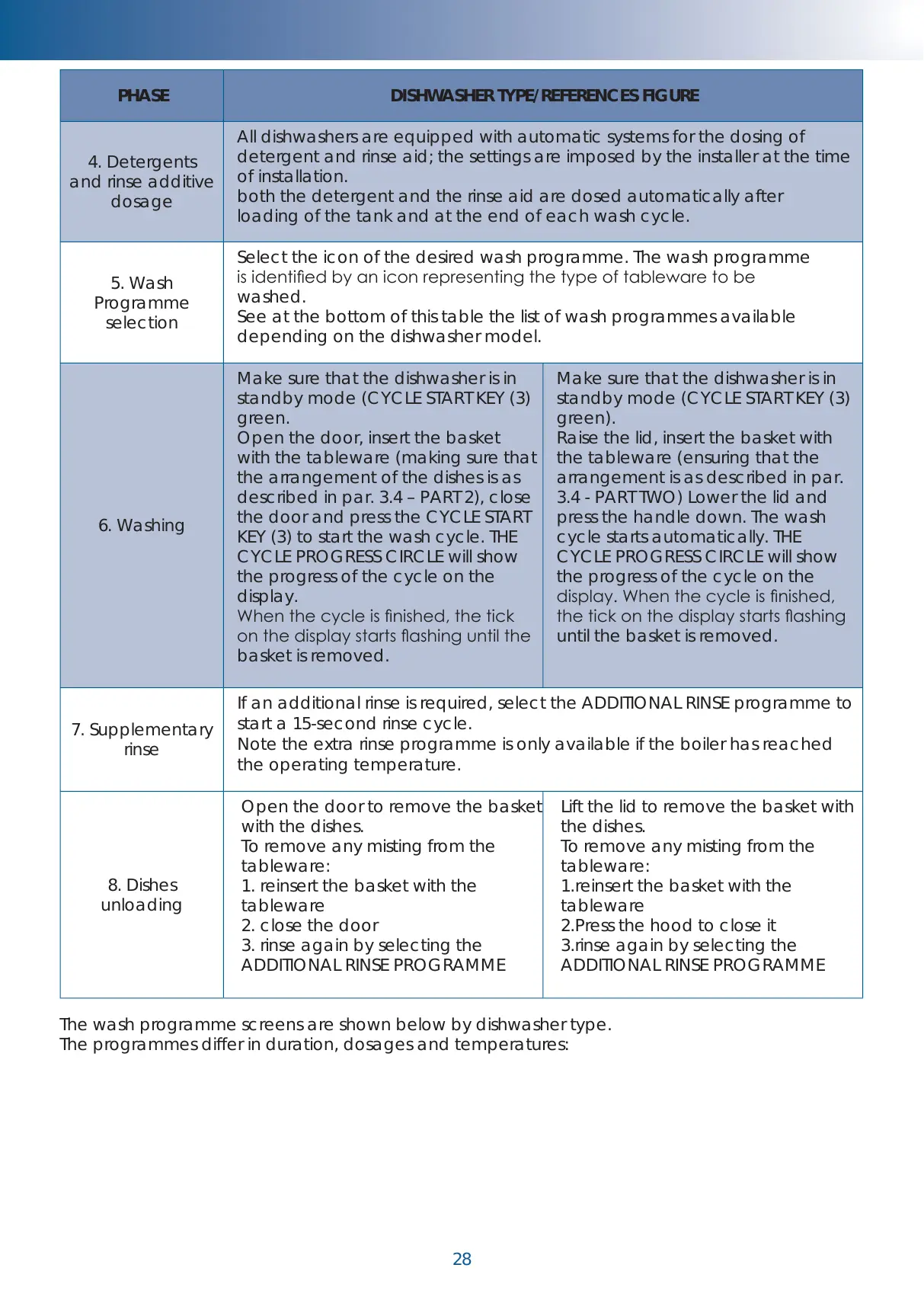 The wash programme screens are shown below by dishwasher type.