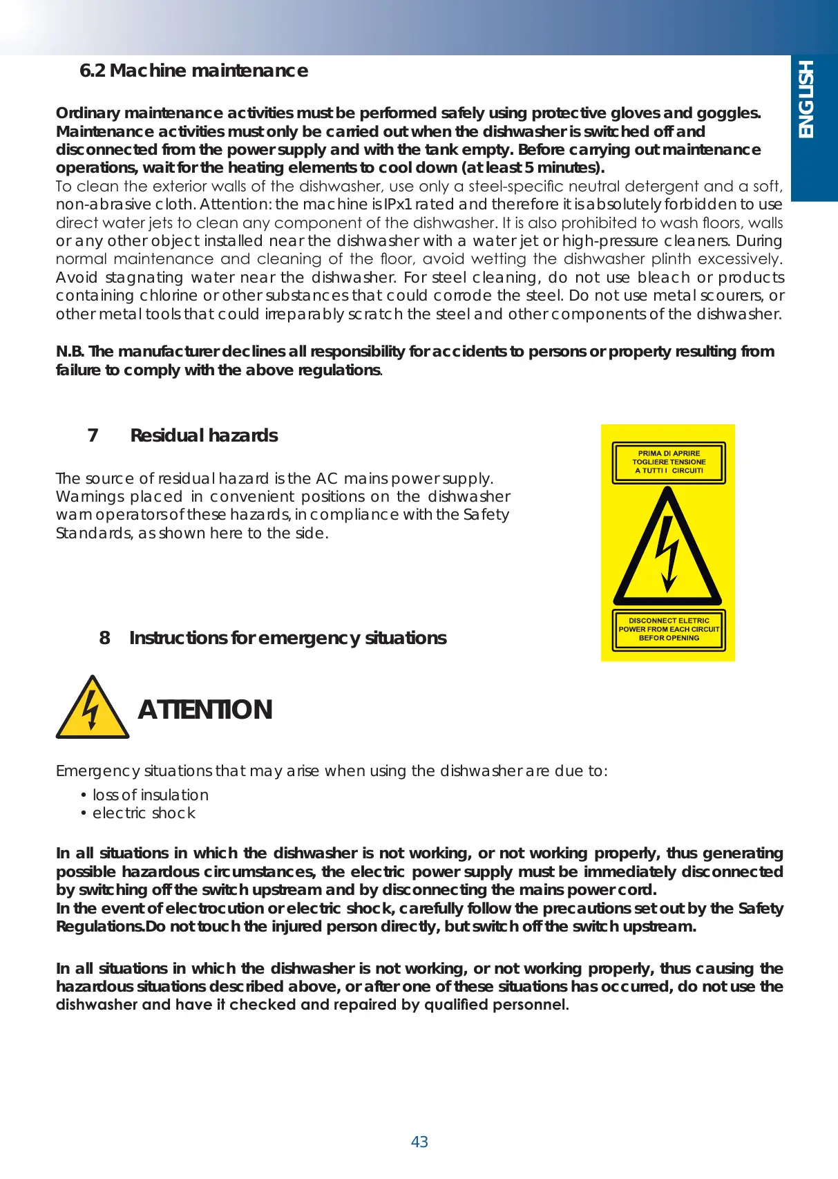 protettivi. Le attività di manutenzione vanno eseguite esclusivamente a lavastoviglie spenta e