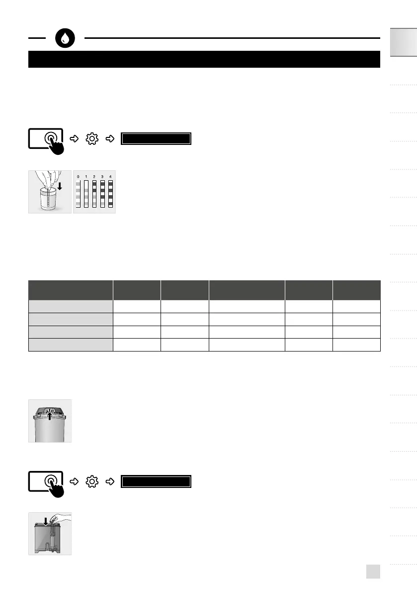 Dip the water-hardness testing stick (8) supplied with the machine in your glass of water.