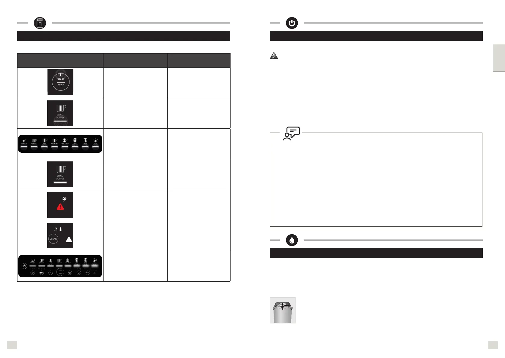 Všechny ikony nápojů svítí Čištění nebo údržba probíhají