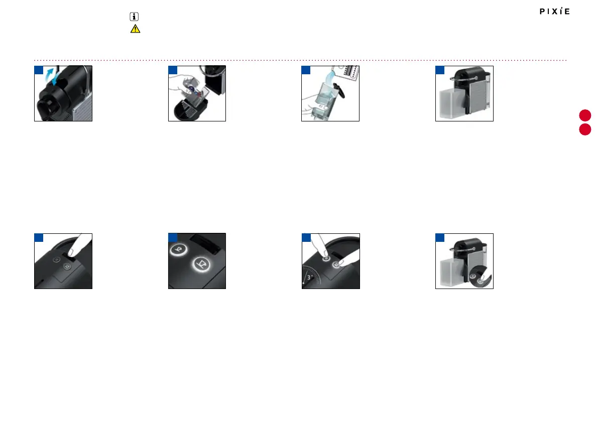 Opróżnić tackę i pojemnik zużytych kapsuł. Napełnić zbiornik wody 0.5 L wody i dodać płyn