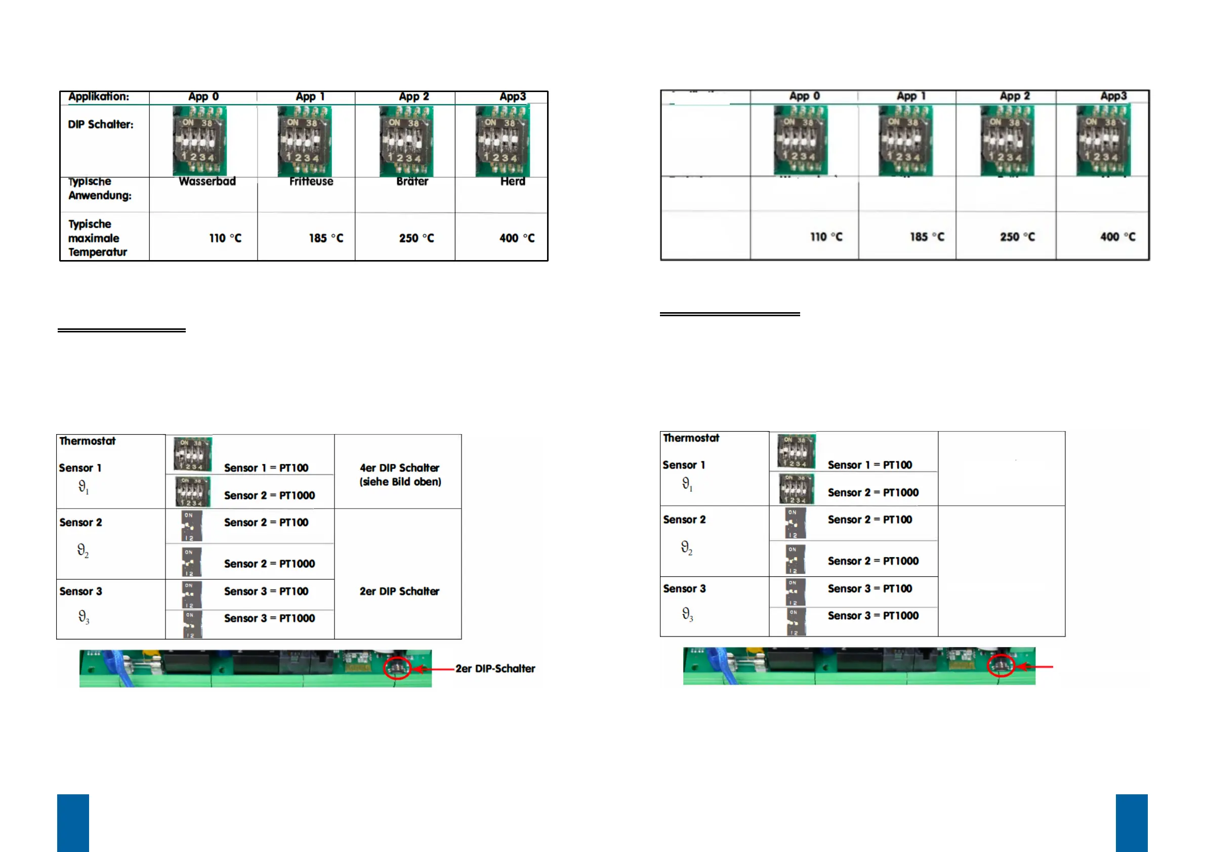 Es können sowohl PTl00 als auch PTl000 Temperaturfühler ausgewertet werden. Über DIP-Schalter wird die