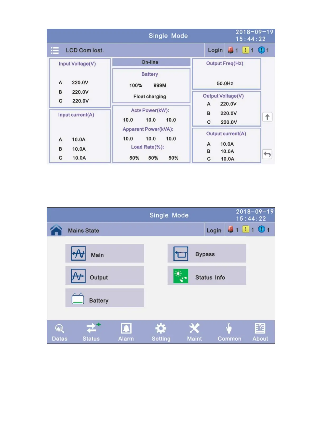 4.3.2 Status: View the voltage and current of the main, bypass, output, battery (can also