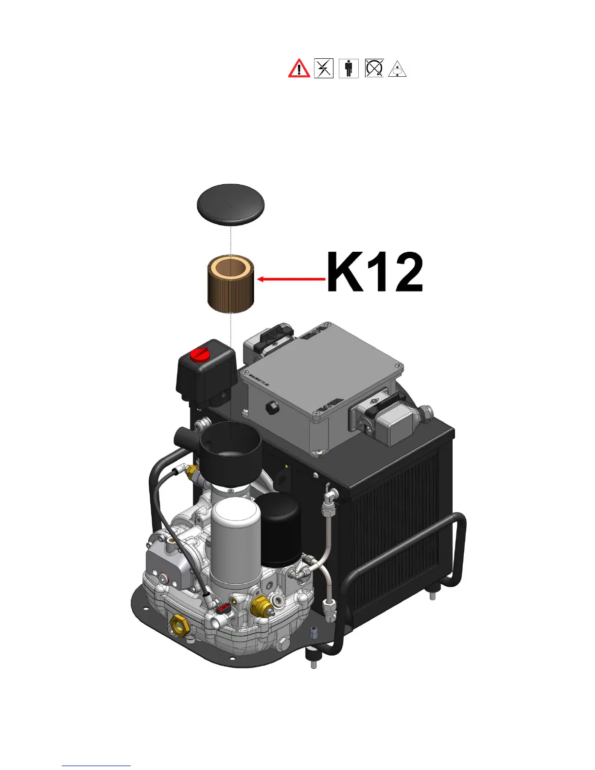 Renew the air filter cartridge every 1000 hours a year of work. Unscrew the top cover and replace