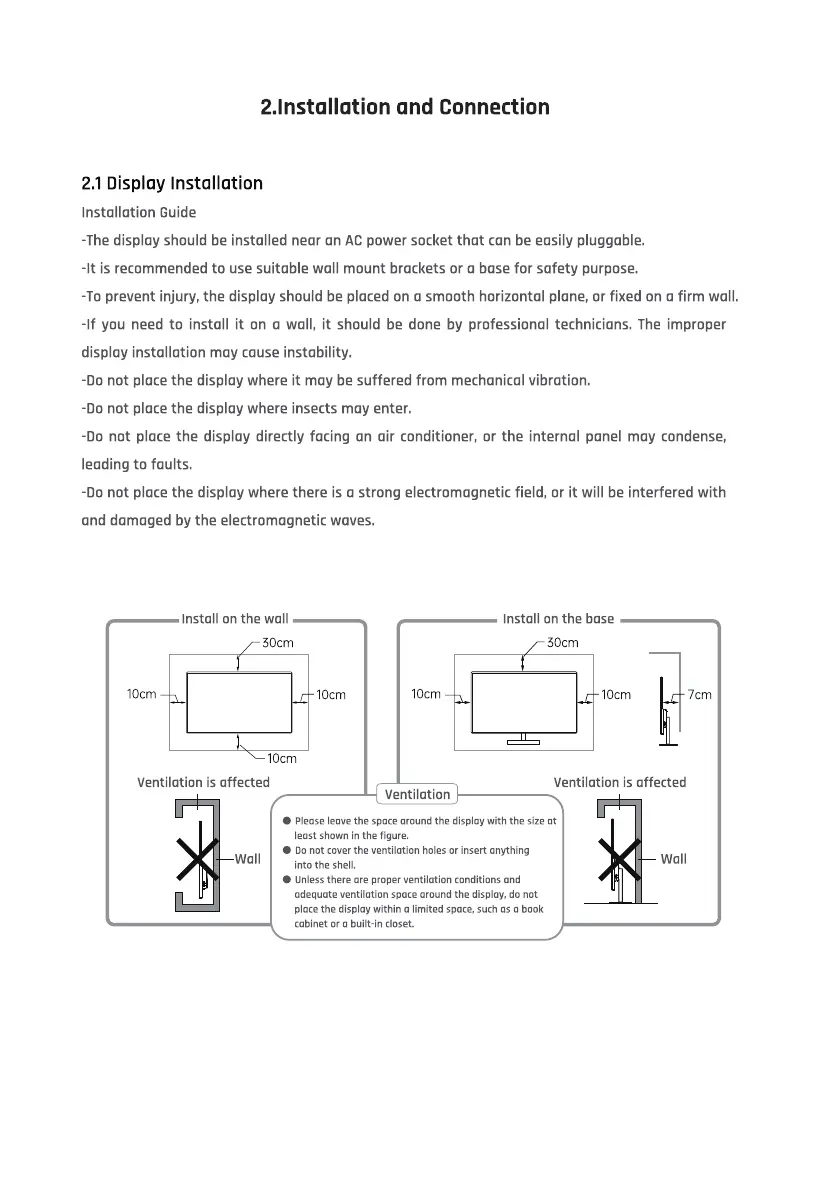 -To prevent injury, the display should be placed on o smooth horizontal plane, or fixed on o firm wall.