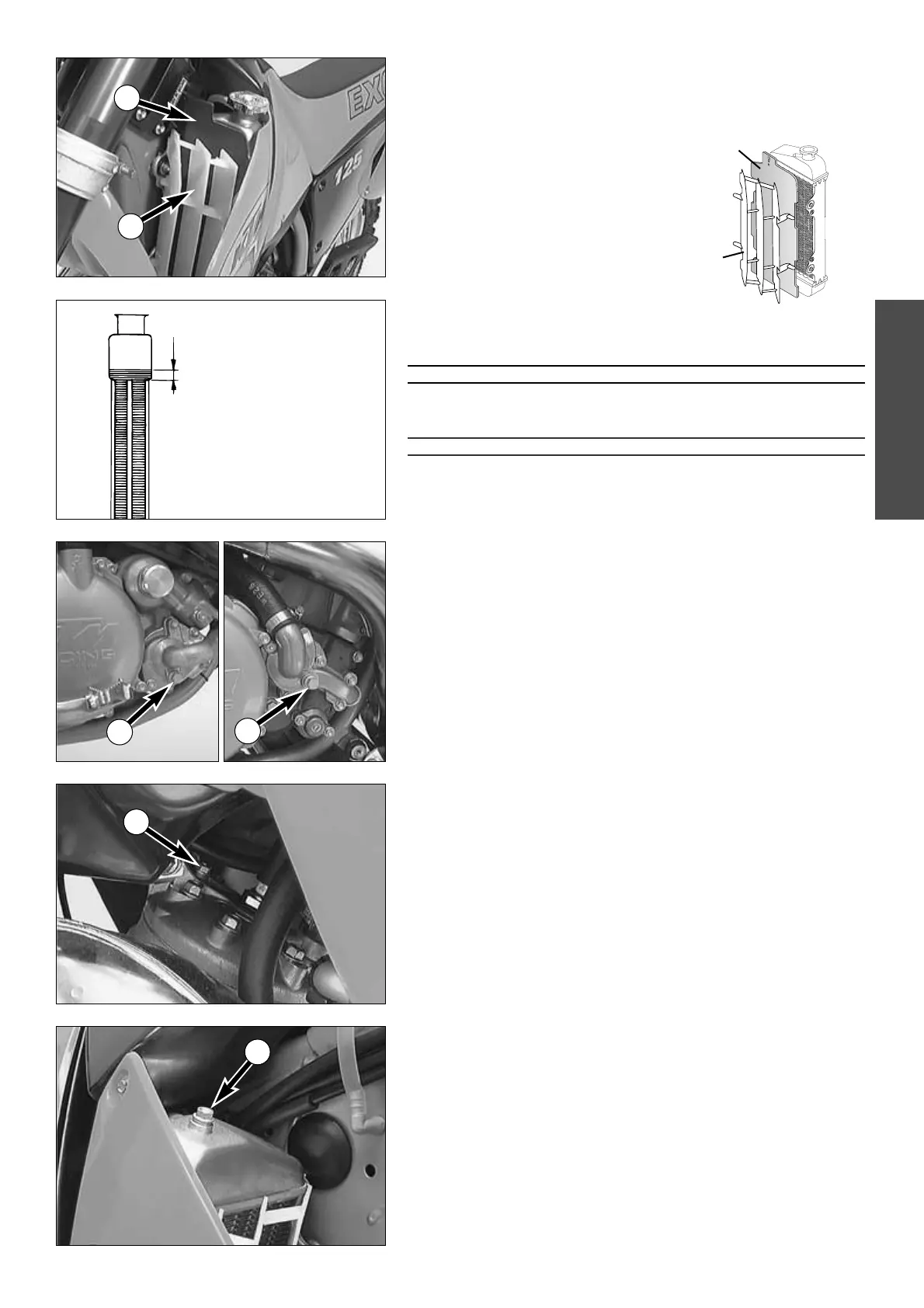 The coolant should be 10 mm (0.4 in) above the radiator fins when the