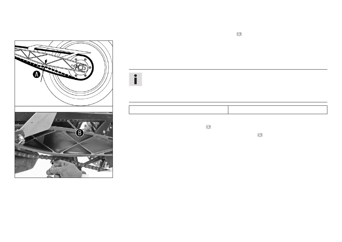 – In the area of the chain sliding guard, press the chain upward toward the swingarm and