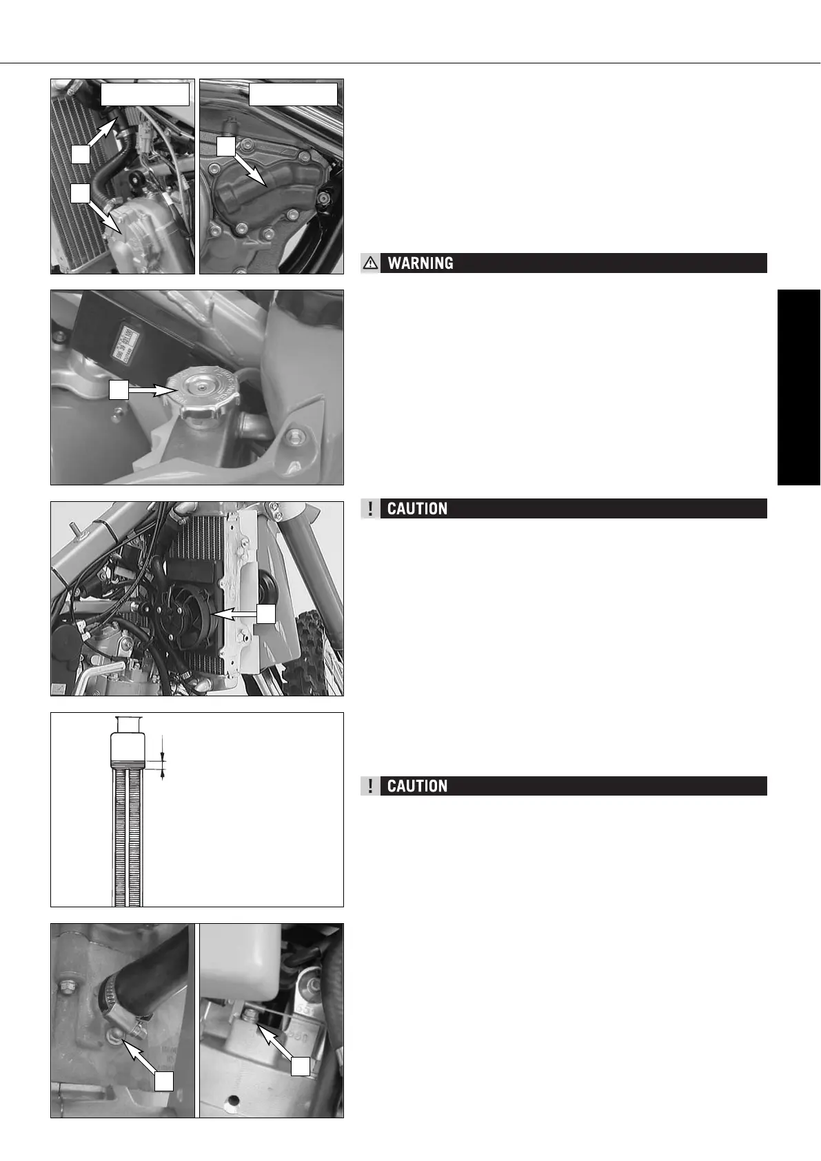 The coolant should be 10 mm (0.4 in) above the radiator fins when the engine