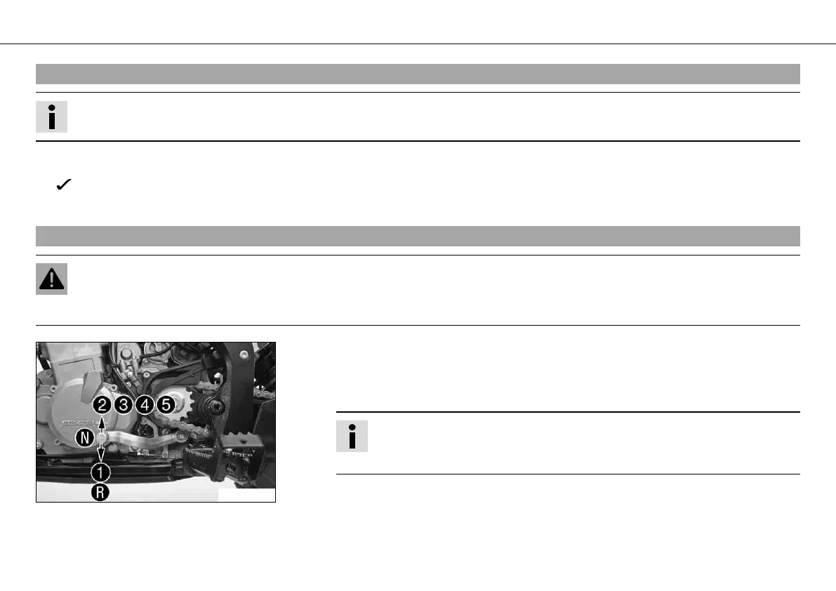 – Do not change into a low gear at high engine speed. The engine races and the rear wheels can block.