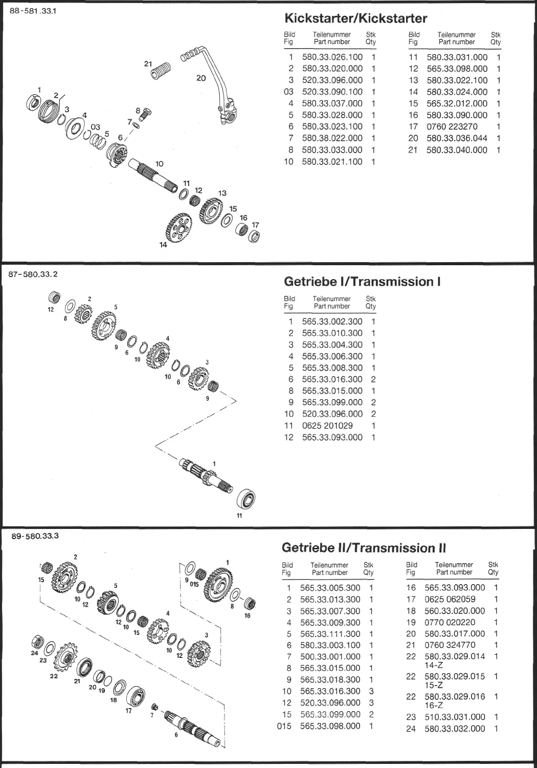 KTM 600 LC4 - Starter and Transmission Systems; Kickstarter Assembly Diagram; Transmission I Components Diagram; Transmission II Components Diagram