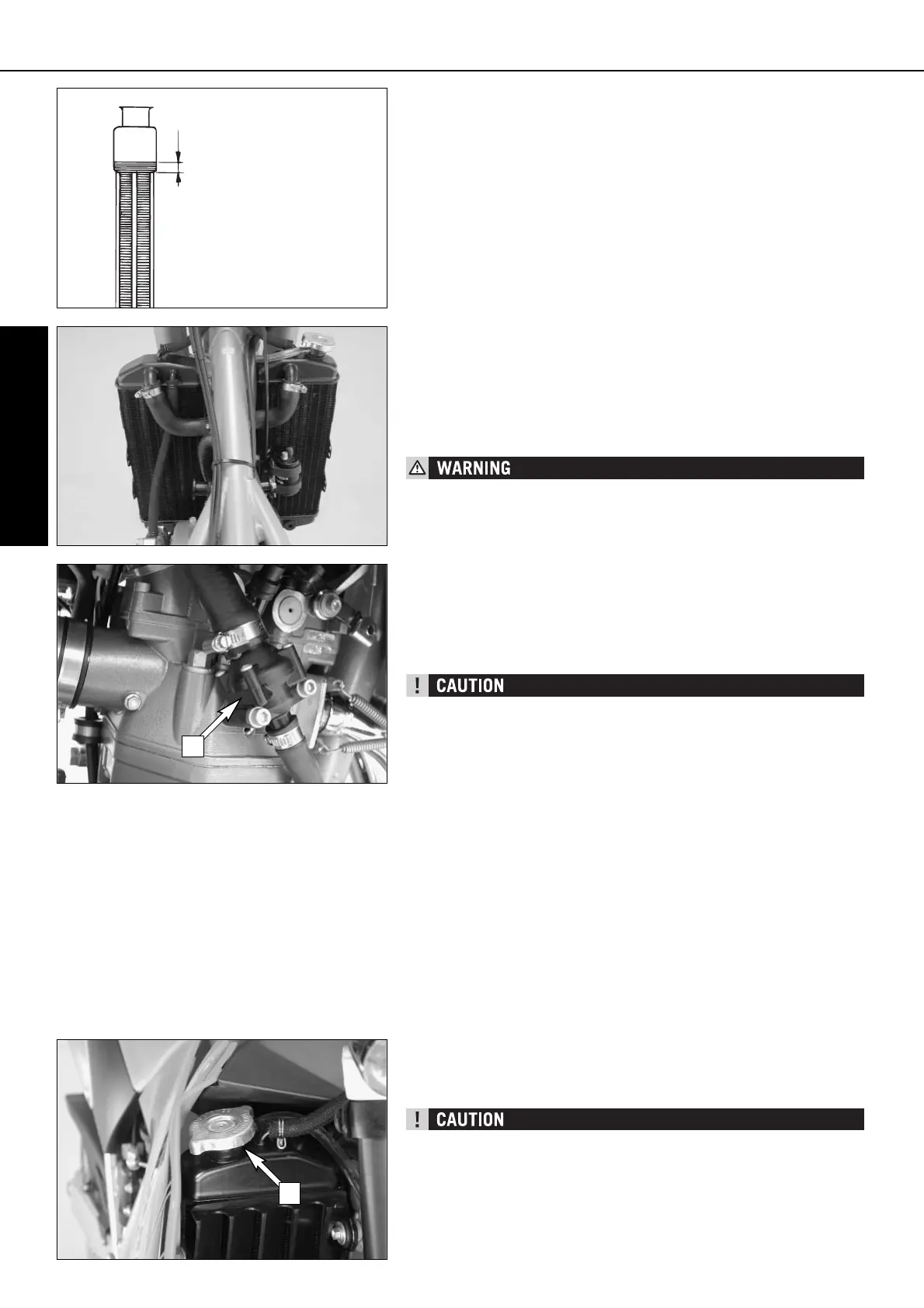 The coolant should be 10 mm (0.4 in) above the radiator fins when the engine