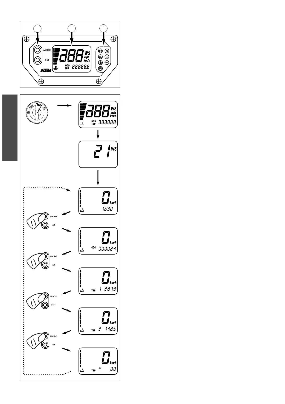 The TRIP 2 mode shows the speed, the temperature of the cooling liquid