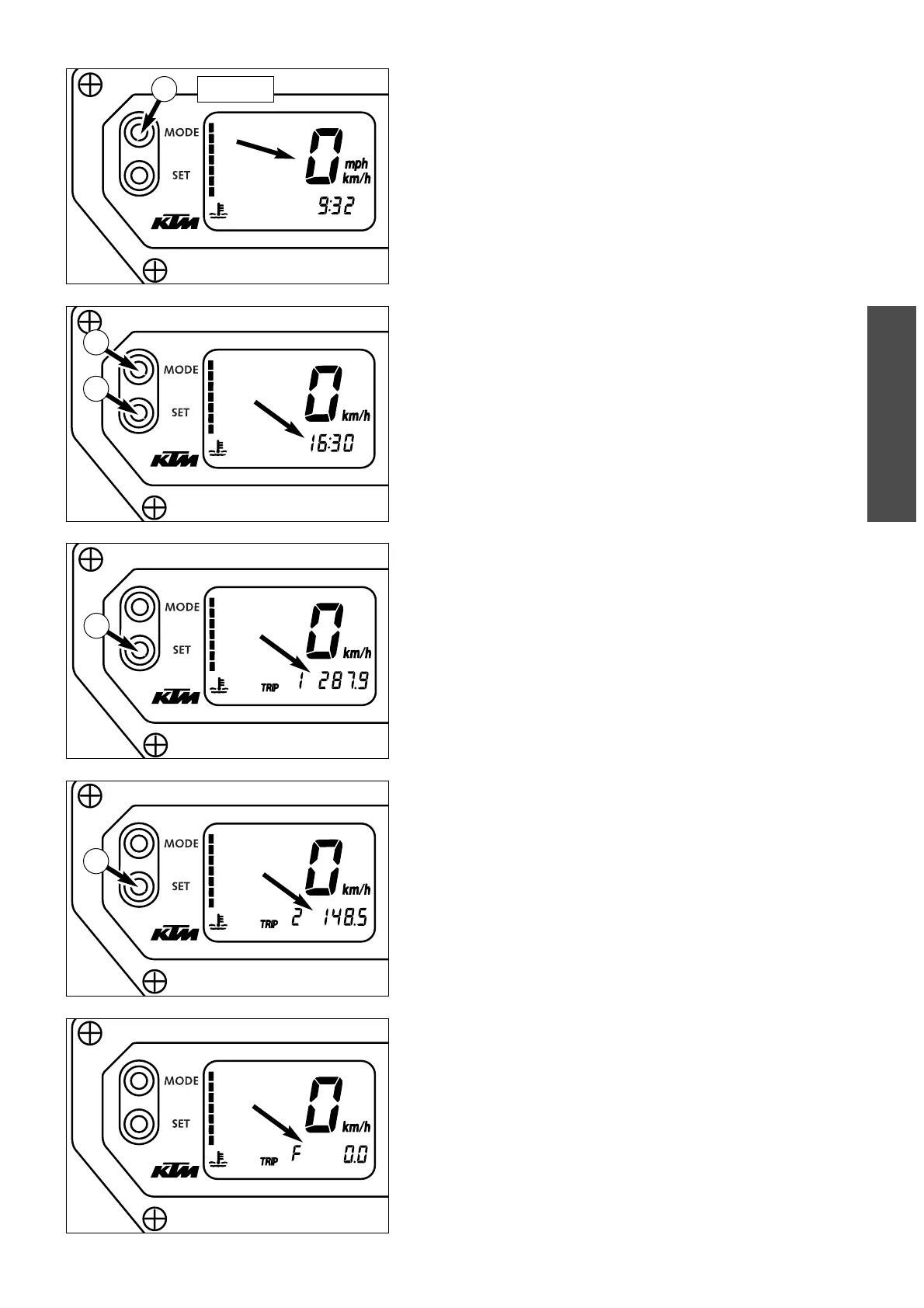 1 button for approx. 10 seconds. The km/h display will switch to