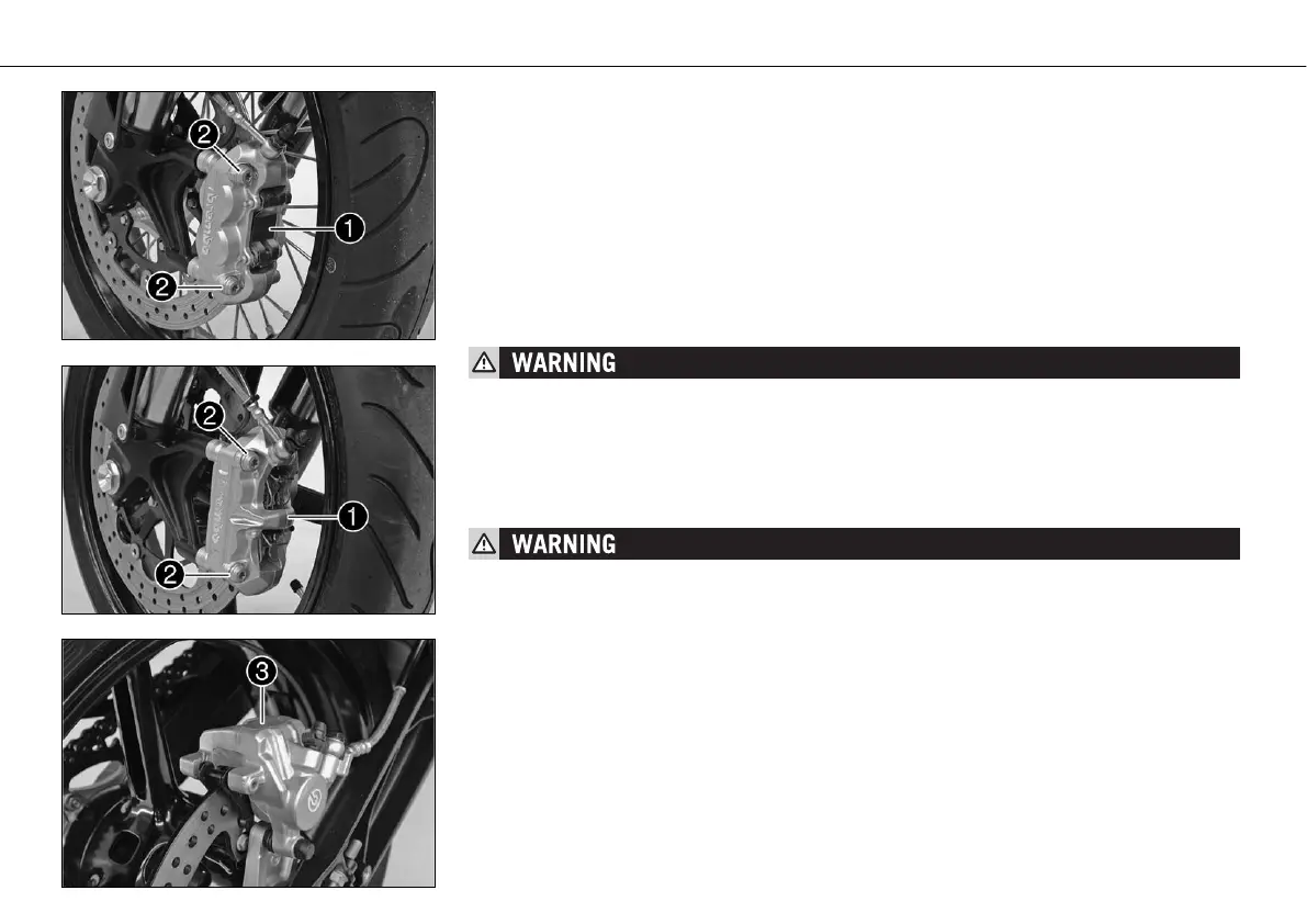 The front brake calipers [1] have 4 brake pistons and are radially bolted to the fork legs.