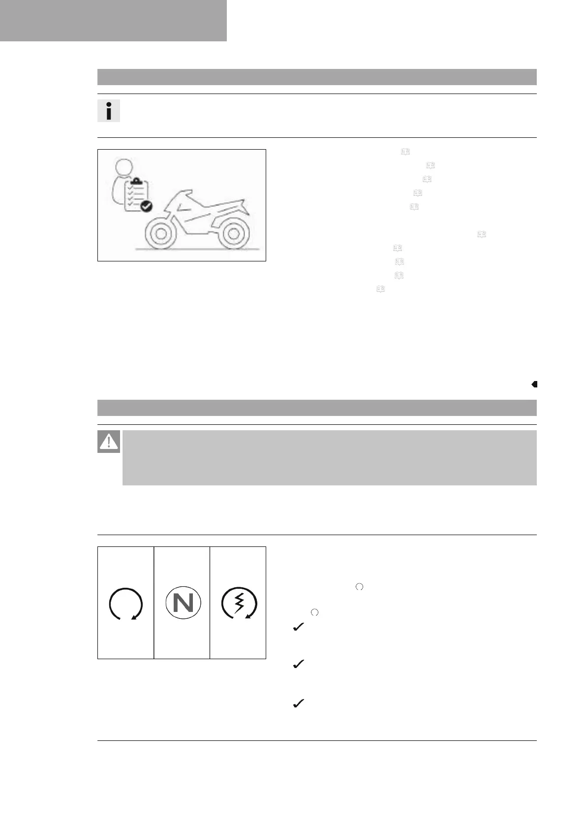 – Take the motorcycle off the side stand and sit on the motorcy-