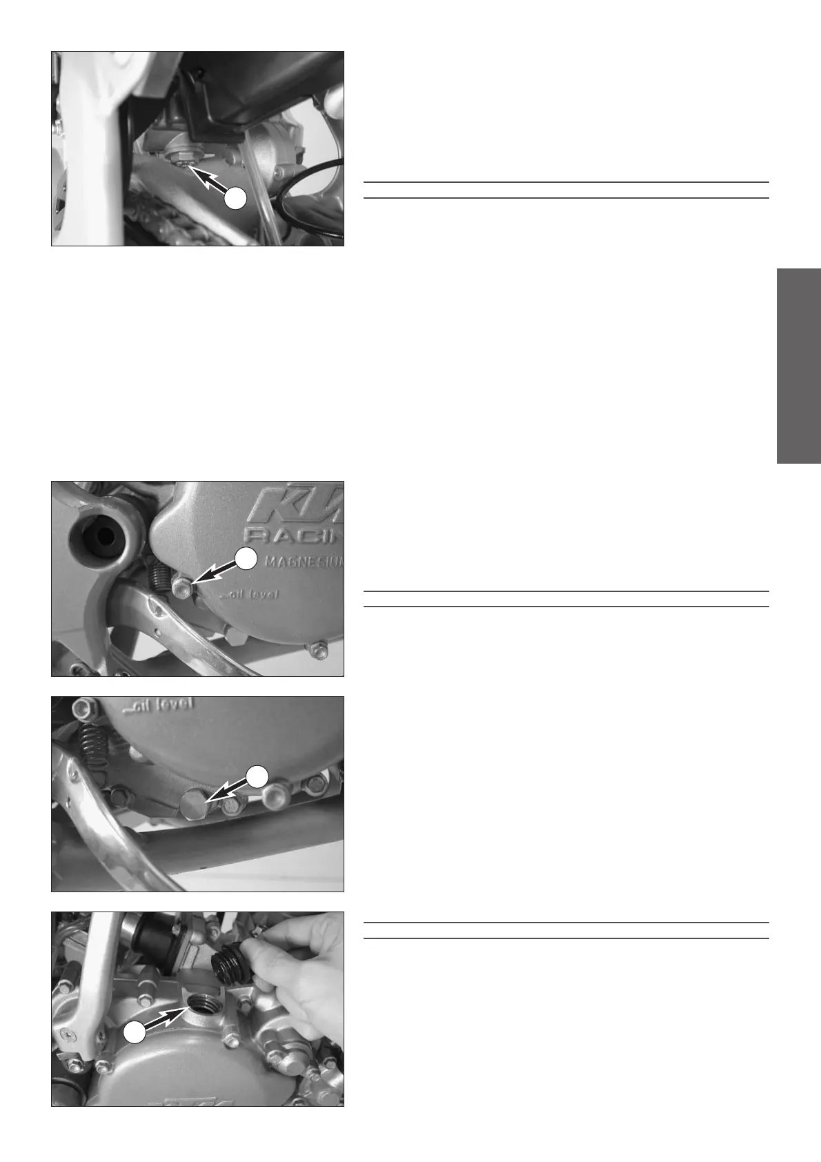 4T 15W50). Mount the filler plug and check the engine for leaks.